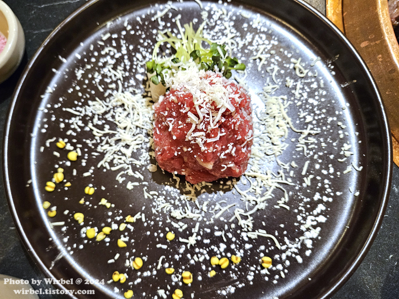 육회에 배, 무순, 율무가 곁들여져 나오고 치즈가 뿌려져서 나옵니다.