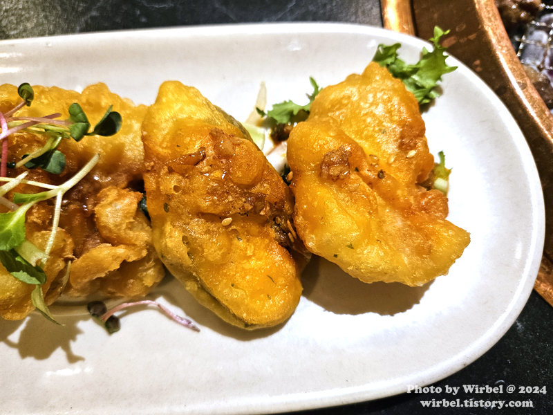 왼쪽이 가지튀김, 오른쪽이 생선튀김으로 일식집 튀김 느낌입니다.