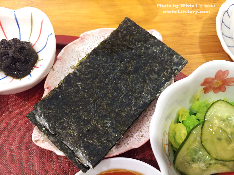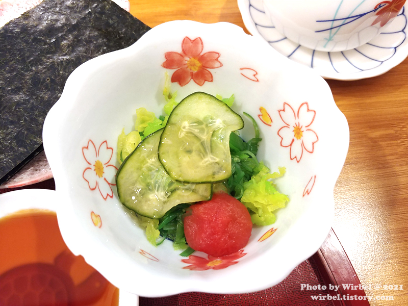 샐러드는 해초, 초절임오이, 매실토마토 등이 들어가서 상큼합니다.