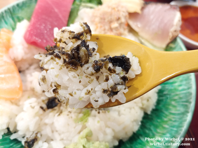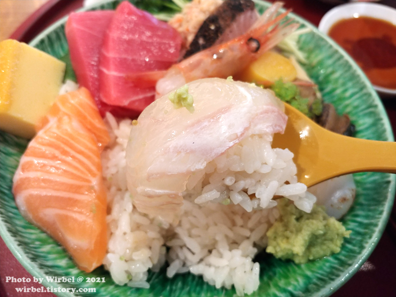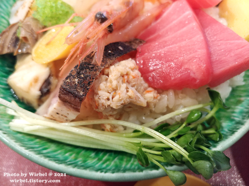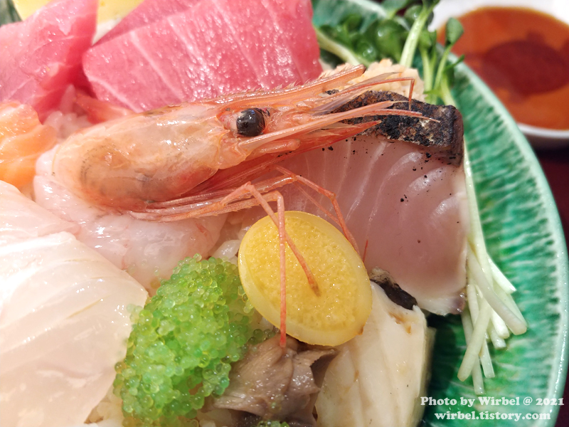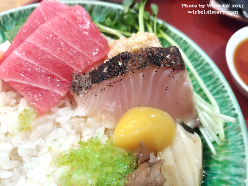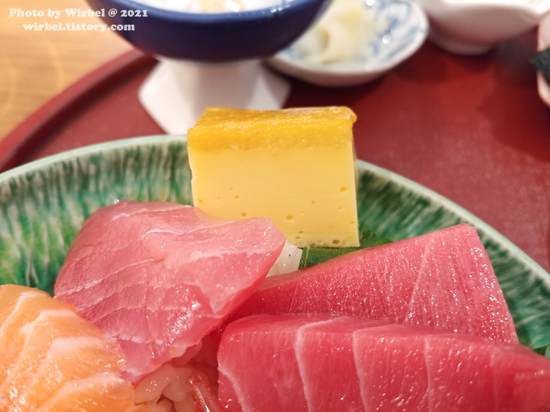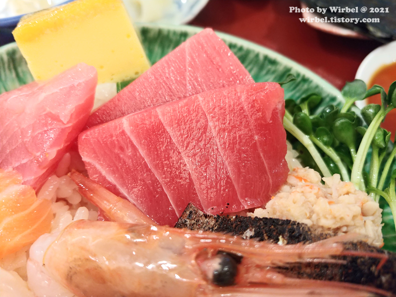 오늘의 카이센동 구성에 참치대뱃살이 있어서 우와 했는데 기대에는 미치지 못했습니다.