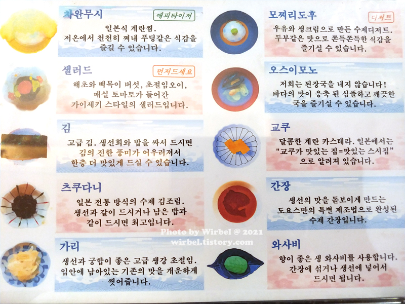 가리비, 소라, 전복, 와사비날치알, 오징어.