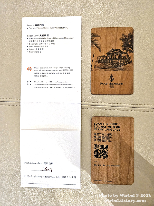 포시즌 호텔 마카오도 친환경을 고려한 듯 객실키가 플라스틱이 아닌 나무키를 사용하고 있습니다.