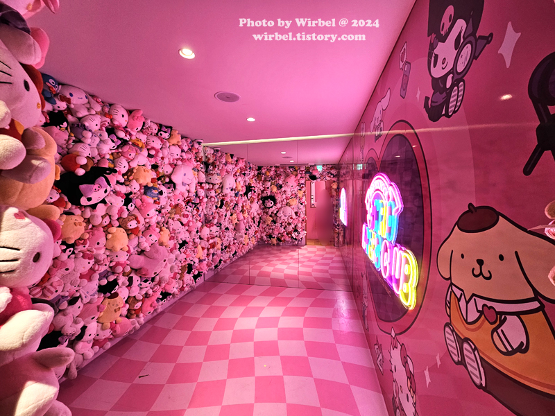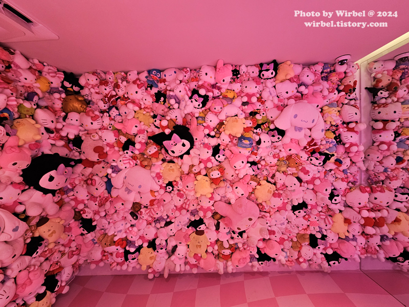 산리오러버스클럽 2층 포토존은 한쪽 벽면이 산리오 인형으로 가득 차있습니다.