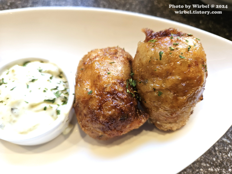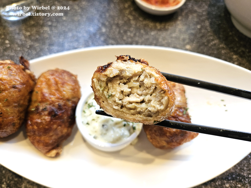 허브와 각종 재료들로 24시간 재운 닭고기를 다져 닭껍질에 말아 내어 튀겨낸 교자.