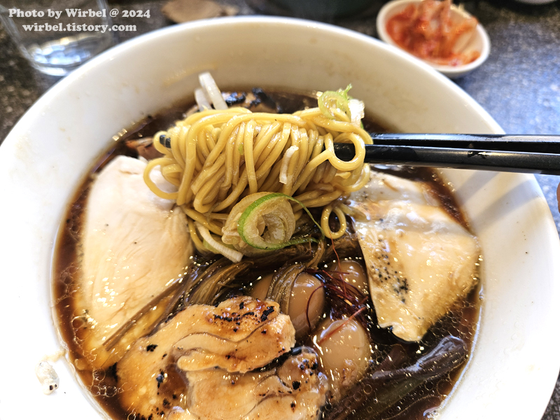 간장을 더해 풍미와 담백함을 느낄 수 있는 진한 흑색 라멘.