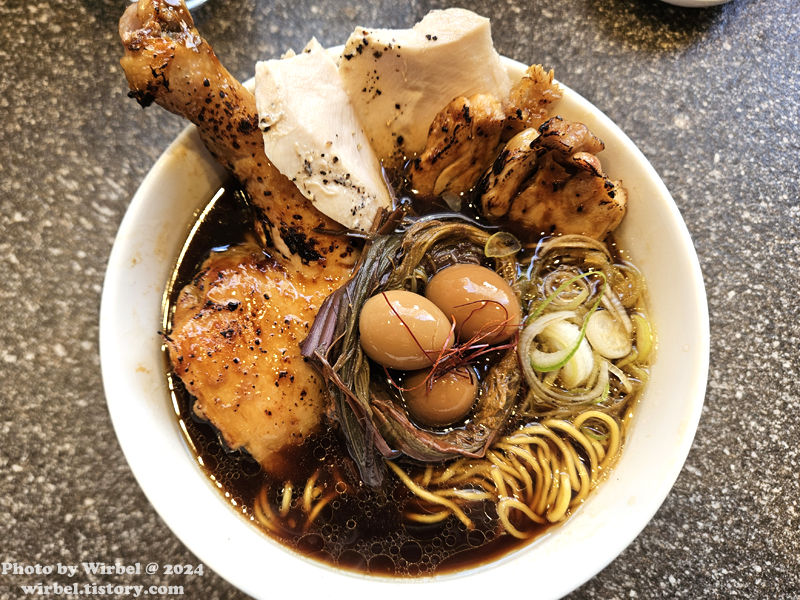 육수에 간장과 소스가 더해진 흑색 라멘입니다.