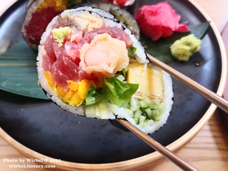 후토마끼가 크기가 크더라도 안의 재료들의 조화를 보기 위해서 한입에 넣어서 먹어봅니다.