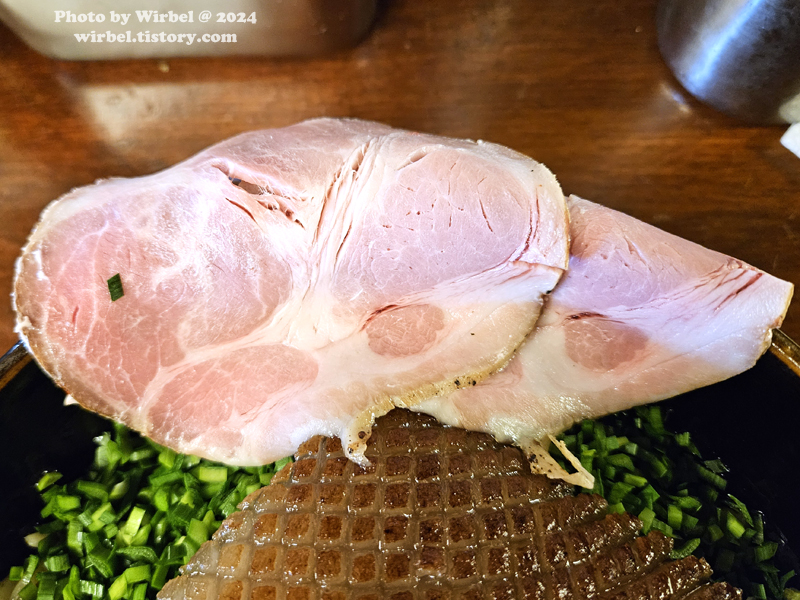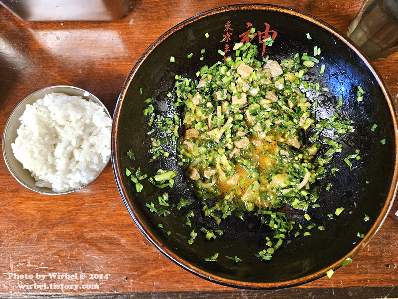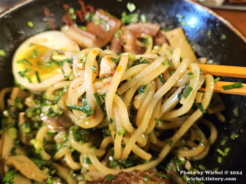 토핑을 잠시 한쪽에 덜어두면 기본 아부리소바에는 부추가 위에 덮고 있습니다.