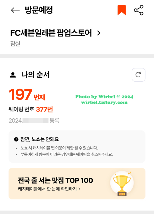 FC세븐일레븐 팝업스토어 웨이팅 시스템은 캐치테이블(Catch Table)을 사용하고 있습니다.