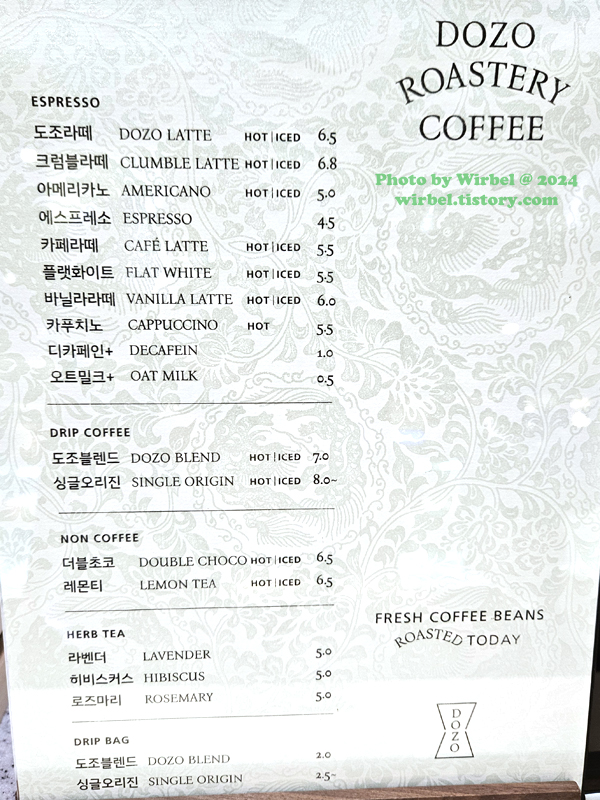 판교 현대백화점 도조커피 메뉴 가격.