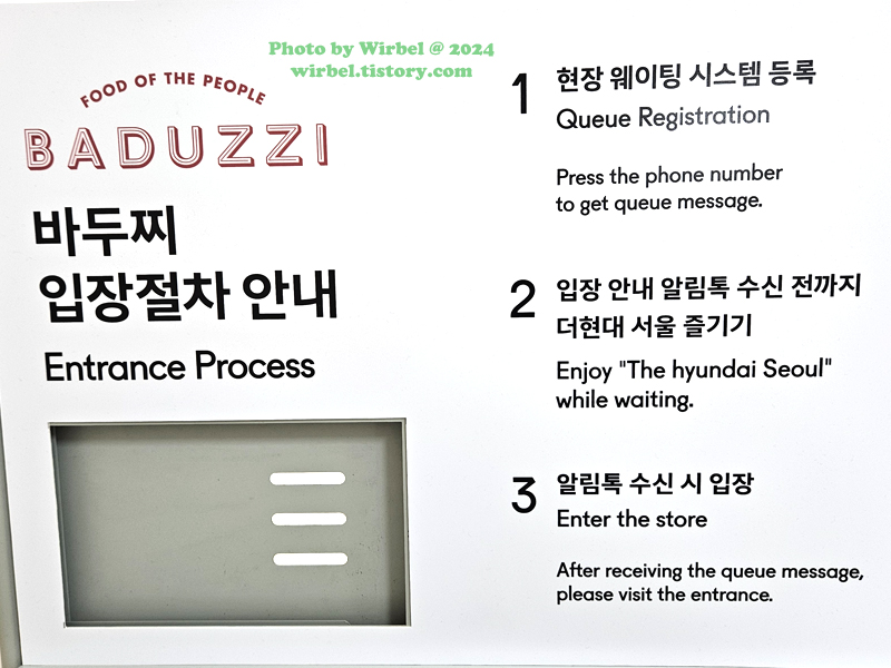 바두찌 웨이팅 시스템으로 현대식품관을 사용하는데 방문시간에는 웨이팅이 없어서 그냥 입장했습니다.