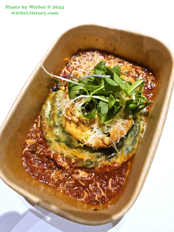 파스타를 돌돌 말아서 나오는 것도 새로운데 오븐에 구워서 겉면은 빵 같은 바삭함이 있습니다.