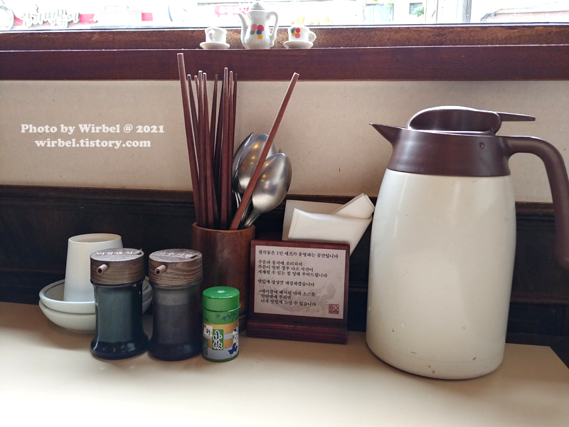 테이블에는 마장식초, 고춧가루, 마라소스(?)가 있습니다.