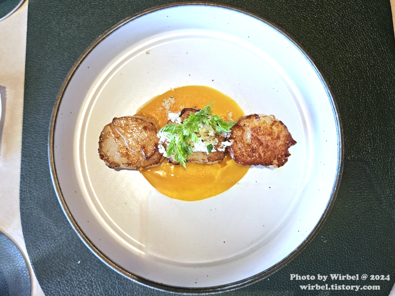 가리비 아래에는 호박 퓌례(?)가 같이 나오는데 이거 가리비를 한층 더 맛있게 해줍니다. 츄릅~~
