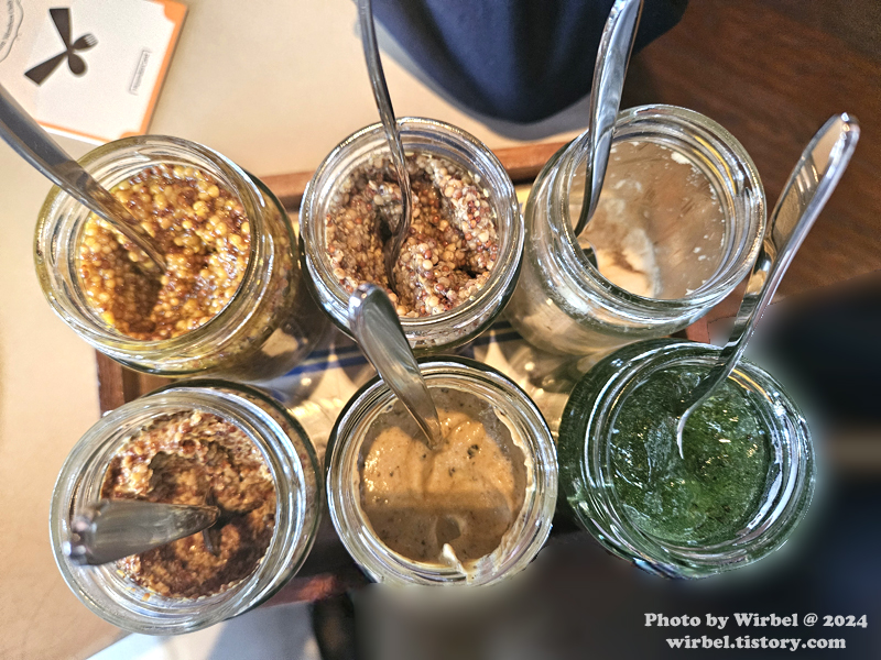 홀그레인 머스터드, 위스키 홀그레인 머스터드, 두 가지 트러플 머스터드, 민트 소스 등이 나옵니다.