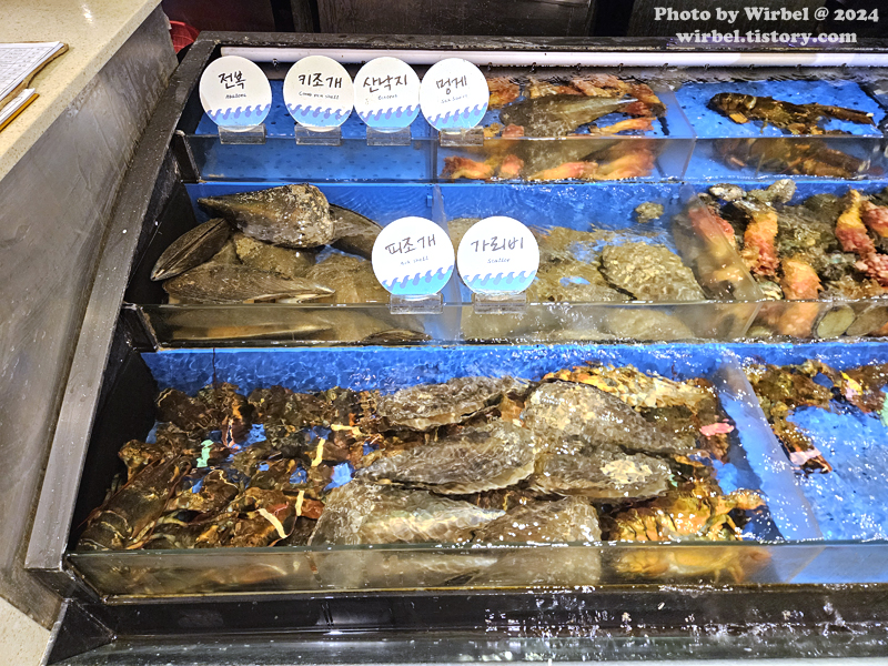 전복, 키조개, 산낙지, 멍게, 피조개, 가리비.