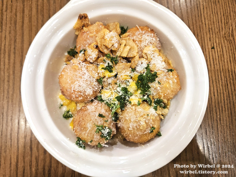 튀김 가자 같은 모양새지만 비슷한 듯 다른 듯 바삭한 감자뇨끼입니다.