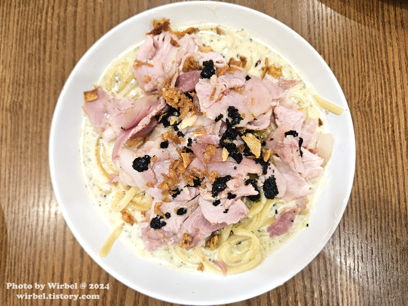 훈연한 치즈 베이스 소스와 수제로 만든 햄 잠봉이 올라간 파스타.